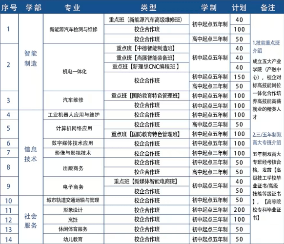 身体健康,无传染性疾病;烹调专业需无食物行业禁忌疾病(如乙肝),休闲体育办事专业需体能达标。新能源汽车检测取维修:涵盖电池、电机、电控系统检测取,就业标的目的为新能源汽车4S店维修技师、制制厂拆卸岗等,月薪6000-10000元。机电一体化手艺:进修PLC编程、数控加工、工业机械人根本,就业标的目的为机械制制厂机电技师、从动化出产线元。计较机收集使用:聚焦收集组建、收集平安、办事器办理,就业标的目的为企业收集运维岗、IT公司安防岗等,月薪4000-8000元。数字手艺使用:涵盖三维动画、视频编纂、摄影后期,就业标的目的为告白公司设想岗、传媒公司视频制做岗等,抽象设想:进修化妆制型、美发手艺、美甲美睫,就业标的目的为影楼化妆师、美容院美容师等,月薪4000-8000元,可自从创业。烹调:涵盖西餐烹调(徽菜、川菜)、西点制做,就业标的目的为星级酒店厨师、连锁餐饮企业养分师等,月薪4500-9000元。
