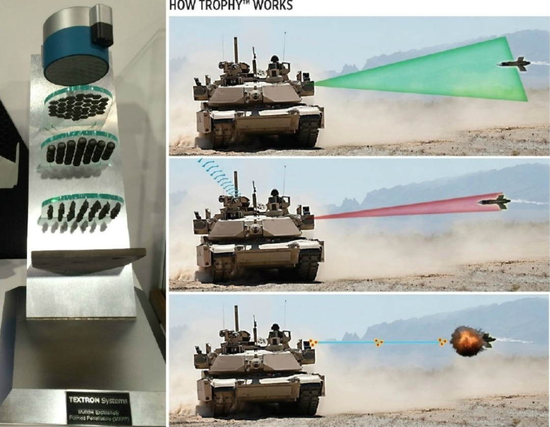 M1A2C上安拆的是以色列“和利品”HV硬杀伤自动防护系统,能够无效拦截反坦克导弹和高速火箭弹。