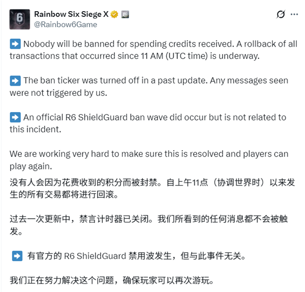 少有一组黑客操纵《彩虹六号:》后端办事器的缝隙,取得了封禁权限和物品点窜能力,向玩家账号发放了巨额逛戏货泉,总金额估算高达339万亿美元划一价值。