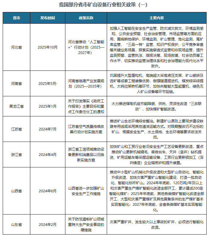 我国及部门省市矿山设备行业相关政策:提拔矿